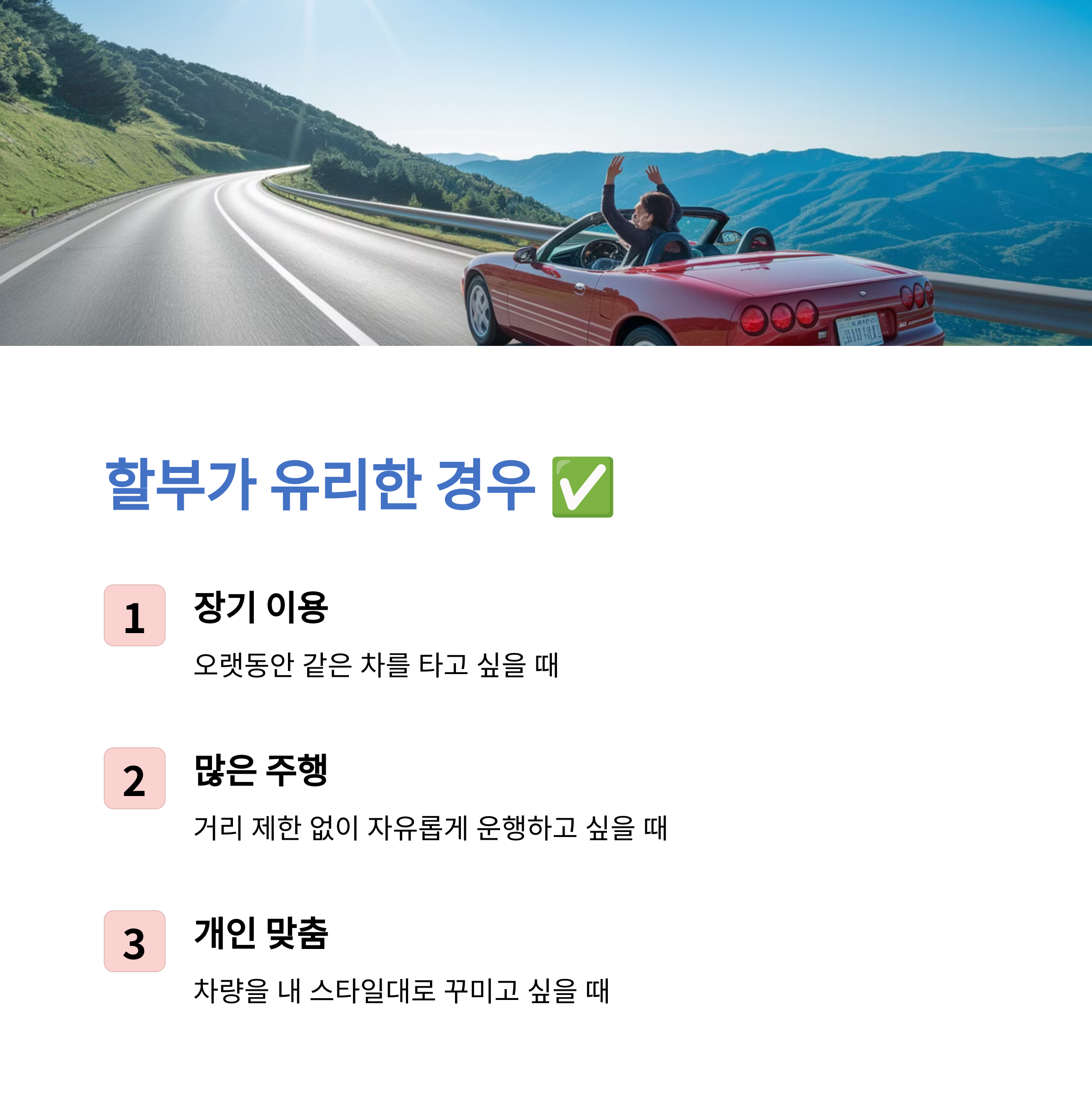 ✔ 차를 오래 탈 생각이고, 완전히 내 차로 만들고 싶다면? → 할부 🚗