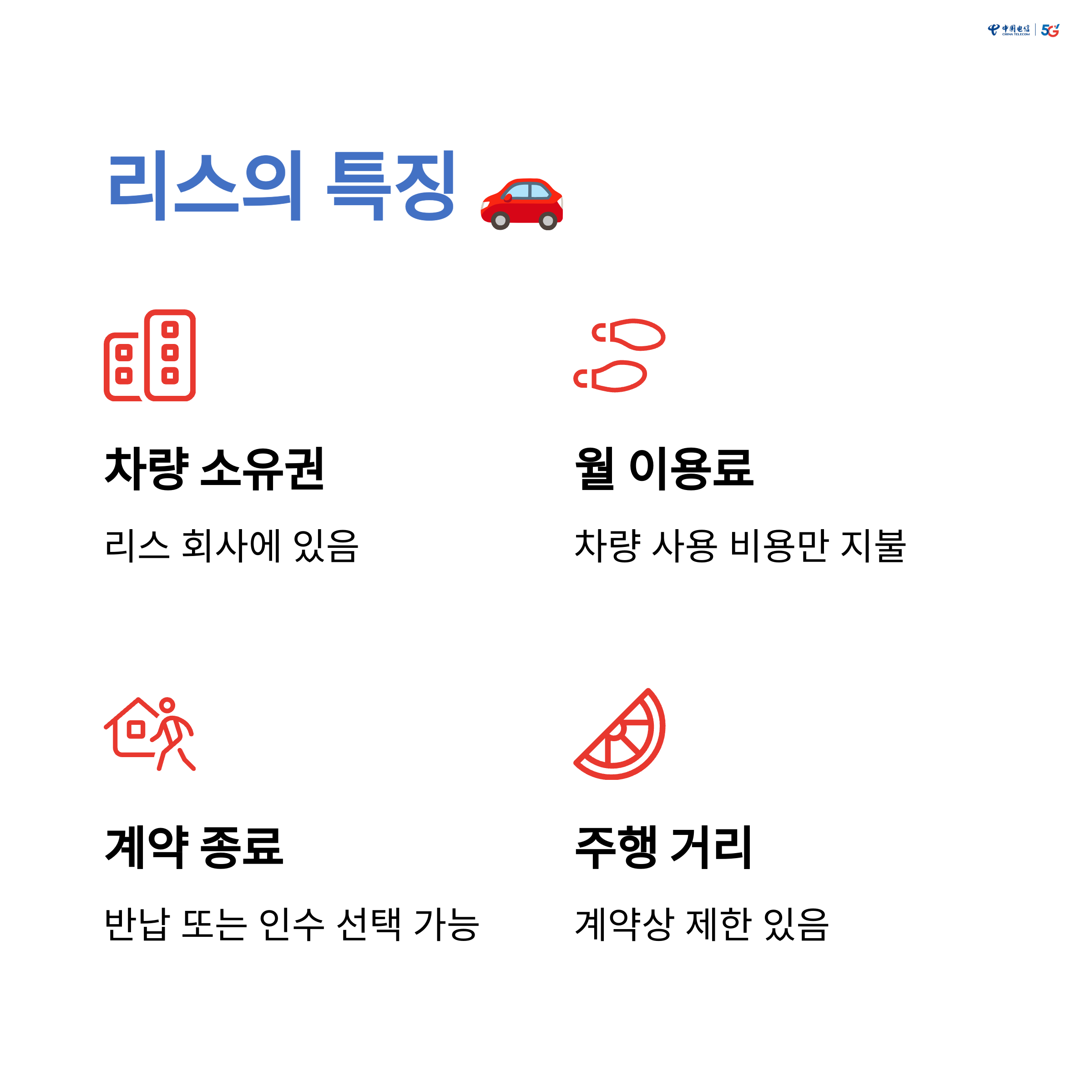 - 목돈 없이 차를 이용하고 싶다면 리스가 부담이 덜함!