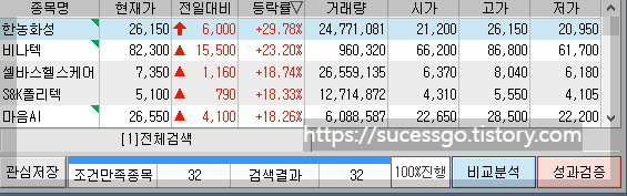 총 32의 종목이 당일 검색되었으며 모두 양봉 마감 했습니다. 상한가로 마감한 종목도 보이네요.