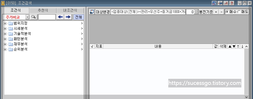 영웅문 HTS에서 [0150] 조건검색 창을 열어 줍니다.