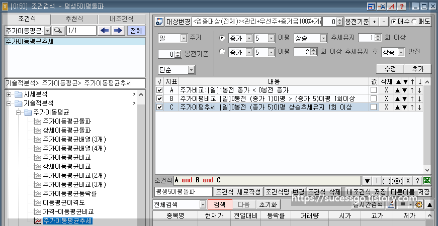 조건식 '주가이동평균추세'를 검색하여 동일하게 작성 후 추가해 줍니다.