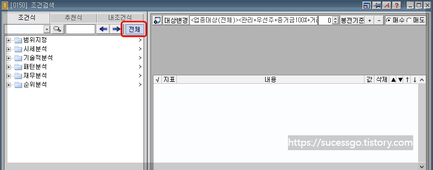 첫번째 방법은 좌측 상단 3개의 탭 중 조건식을 선택 하시면 [전체] 버튼이 보입니다.