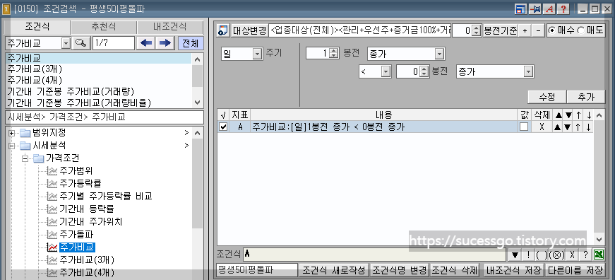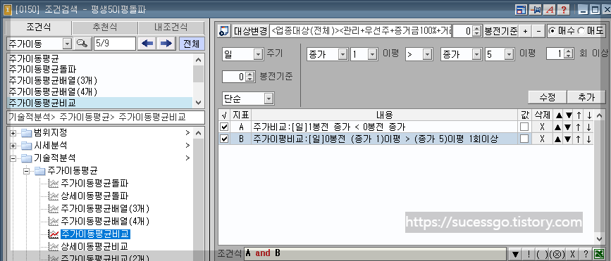 조건식 '주가이동평균비교'를 검색하여 동일하게 작성 후 추가해 줍니다.