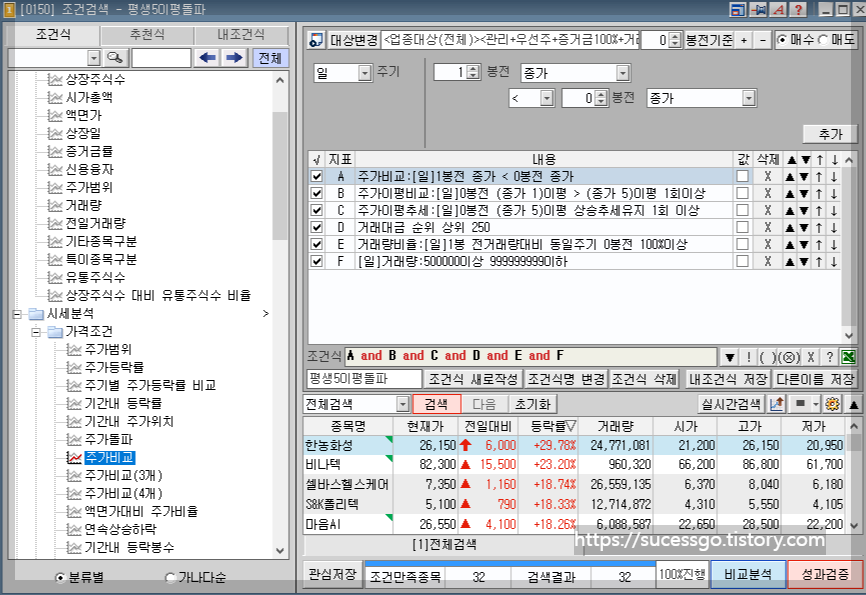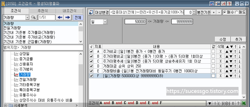 F조건은 현재의 거래량이 50만주 이상 거래가 되고 있다는 의미입니다.
