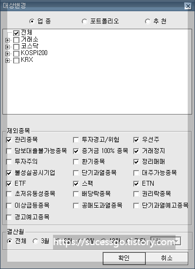 위 그림과 같이 업종 전체 선택된 상태로 제외종목 리스트에서 검색되지 않았으면 좋겠다는 항목을 선택하시면 됩니다. 대상변경은 수정이 자유로우니 필요에 따라 항목을 수정해 주시면 됩니다.