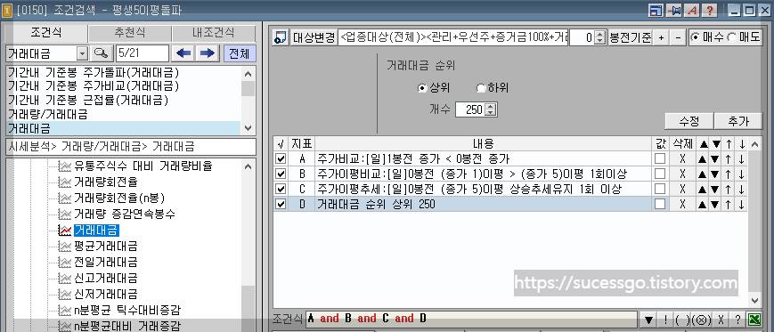 D조건은 당일 거래되는 금액이 전체 중 상위 250개 종목 중 하나의 종목 이라는 의미입니다.