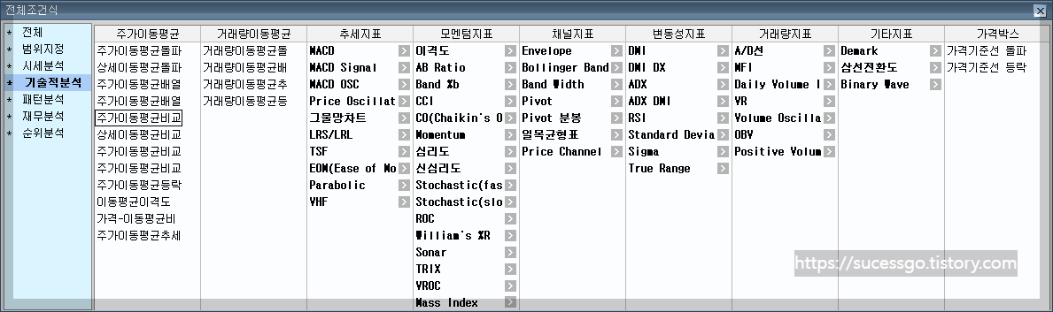 [전체] 버튼을 눌러 아래와 같은 '전체조건식' 창이 열리고 원하시는 조건식을 선택 하는 방법이 있습니다.