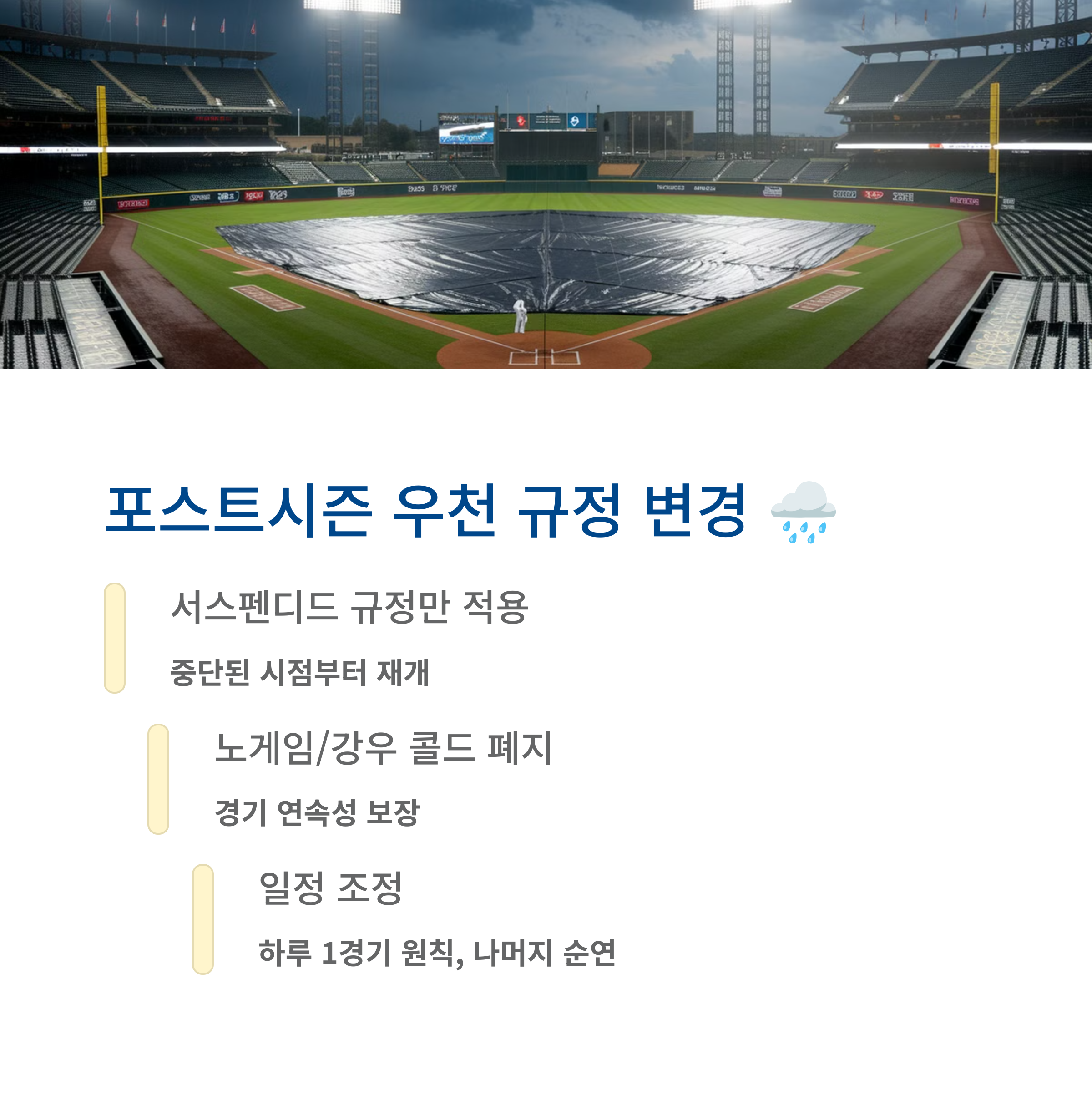 올해부터 포스트시즌 경기 중 비가 오면 강우콜드 없이 서스펜디드 적용!